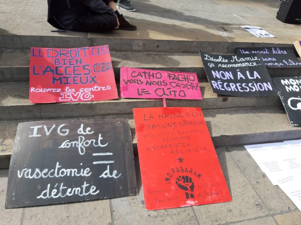 De nombreuses pancartes créatives et colorées rappelaient l’urgence du combat en faveur de l’IVG. Des tables avec les tracts, autocollants et documentations des diverses organisations à l’initiative du rassemblement étaient tenues. L’appel national et l’appel local ont été lus à plusieurs, voix, puis diverses organisations se sont succédé pour des prises de paroles combattives. Puis nous avons chanté et crié des slogans pour bien nous faire entendre. Avant de laisser la place à la Marche climat, à laquelle nous appelions également.